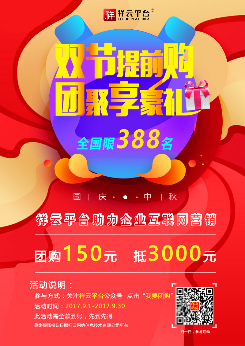 迎中秋,慶國(guó)慶,值此雙節(jié)來臨之際,祥云網(wǎng)絡(luò)助理企業(yè)互聯(lián)網(wǎng)營(yíng)銷,團(tuán)購(gòu)150元抵3000元;顒(dòng)進(jìn)行中……