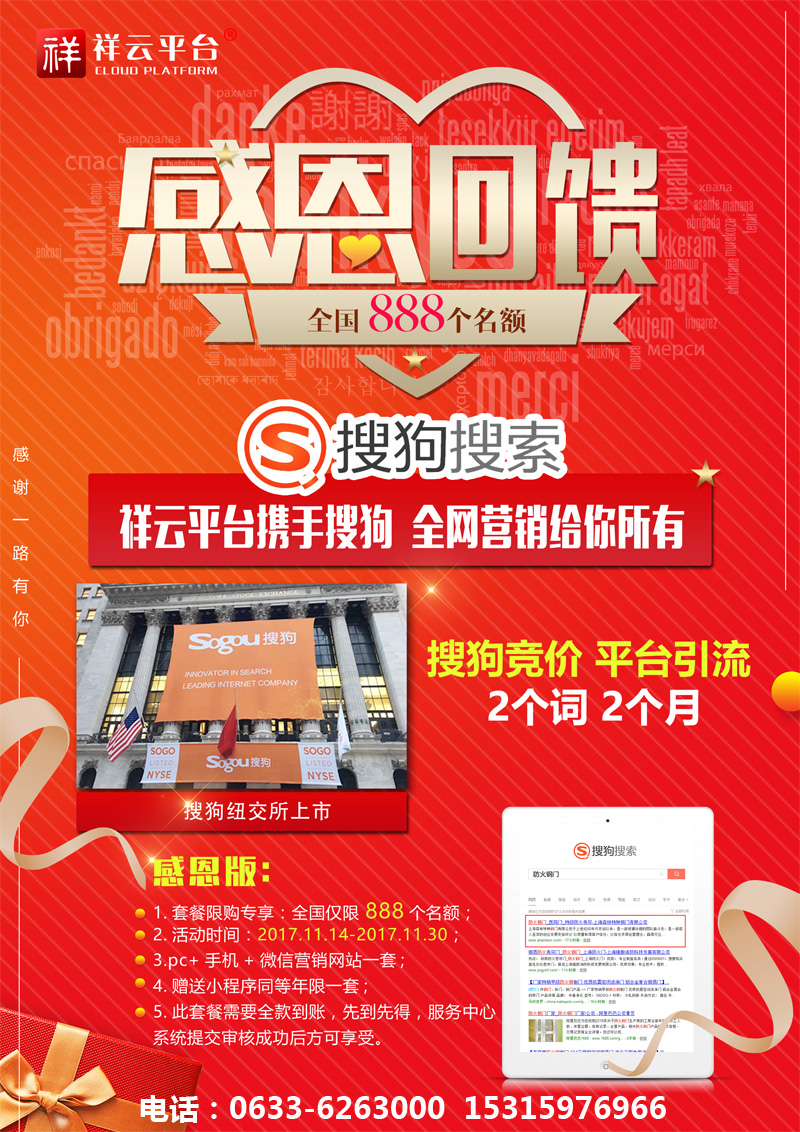 2017年11月9日,搜狗在紐交所上市,成為國內(nèi)第二大搜索引擎,祥云聯(lián)合搜狗,推出2017感恩鉅惠活動:凡簽約祥云營銷型網(wǎng)站,即送搜狗競價關鍵詞,兩個詞,兩個月!名額有限,先到先得!電話:0633-6263000 15315976966